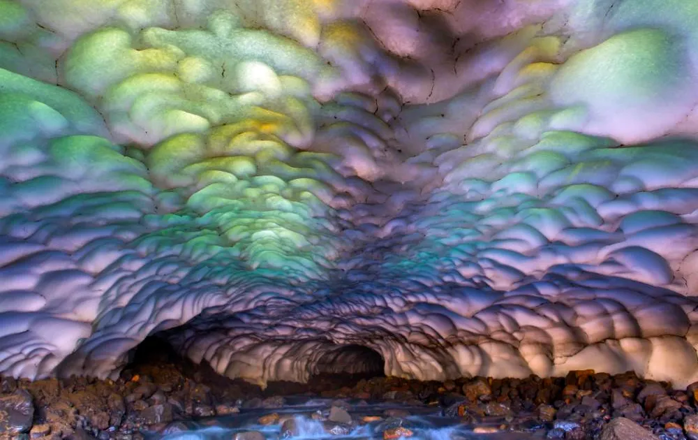 The cave was formed naturally by volcanic steam rising from the active Mutnovsky Volcano. This hot steam slowly melts the lower layers of a glacier, creating large tunnels with shimmering ice walls that glow in shades of blue and green.